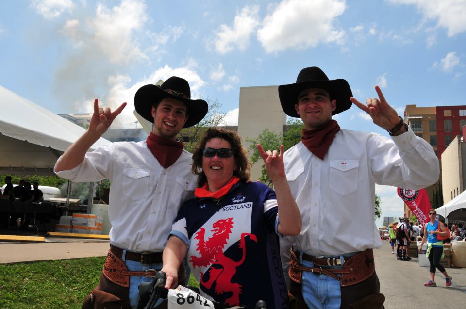 The atmosphere at the finish line was amazing – friendly, cheerful, loud. Harriet had arranged to meet some of our online Facebook friends there, so I crossed the line to the accompaniment of loud cheering from Ayne and Mark Ray, Adam and Toni. Dave and Paul also had family to meet up with so we said our goodbyes at the finish line. A short walk took us all back to the support vehicles, and very pleasantly took in two rather dishy young men dressed in cowboy gear who, in a very gallant manner, overlooked the rather noticeable whiff from my oxsters to teach me how to hook me some horns. Or whatever it is Longhorn fans say – I wasn’t really paying any attention to what they were saying, if ya know what I mean. 😉