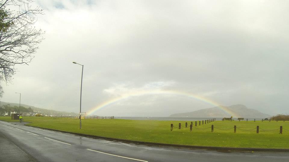 Off we went again after lunch, all buoyed up to do the hilly stretch of the route. I have to admit I found this quite challenging and lagged behind on several occasions. It was, however, markedly better than the previous attempt. The rain was falling quite heavily at times now so i was probably going a little more cautiously than usual given that I was on a borrowed bike. The descent into Lamlash coincided with a rather splendid rainbow over the Holy Isle but no apparent pots of gold were strewn across our path.