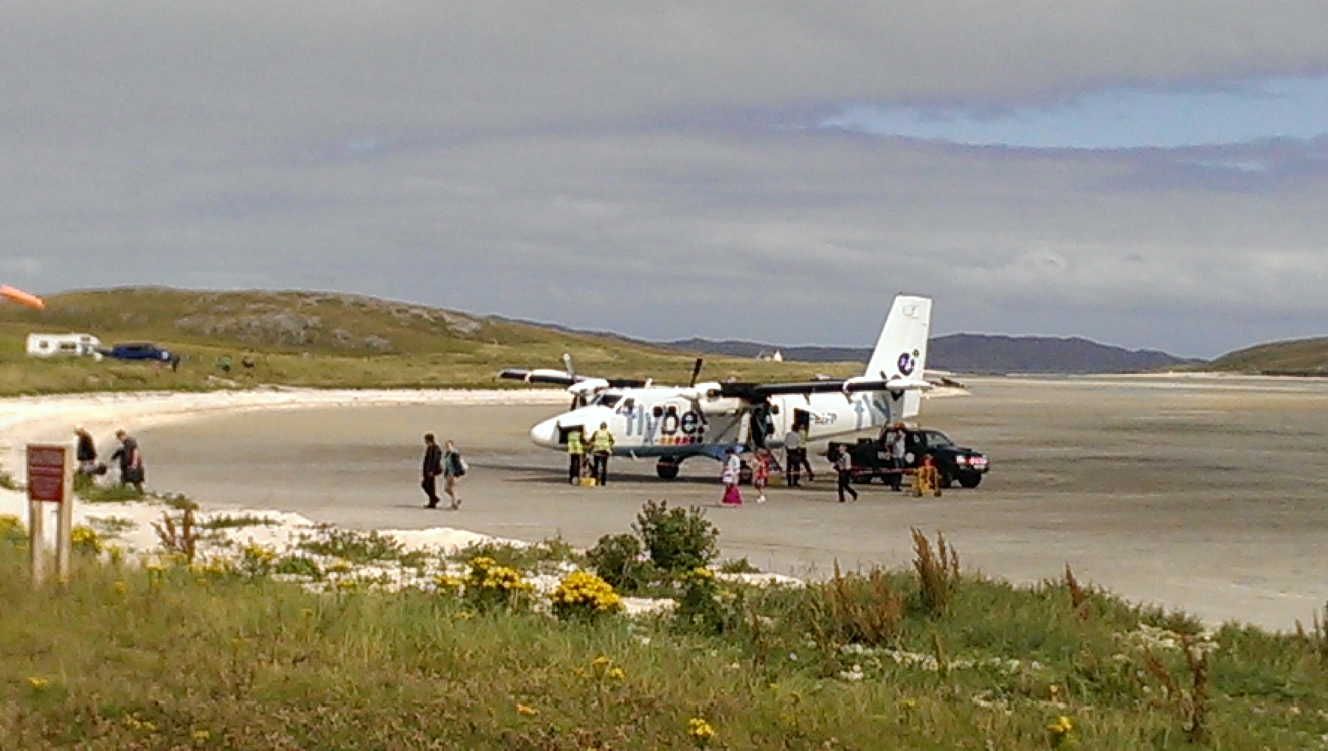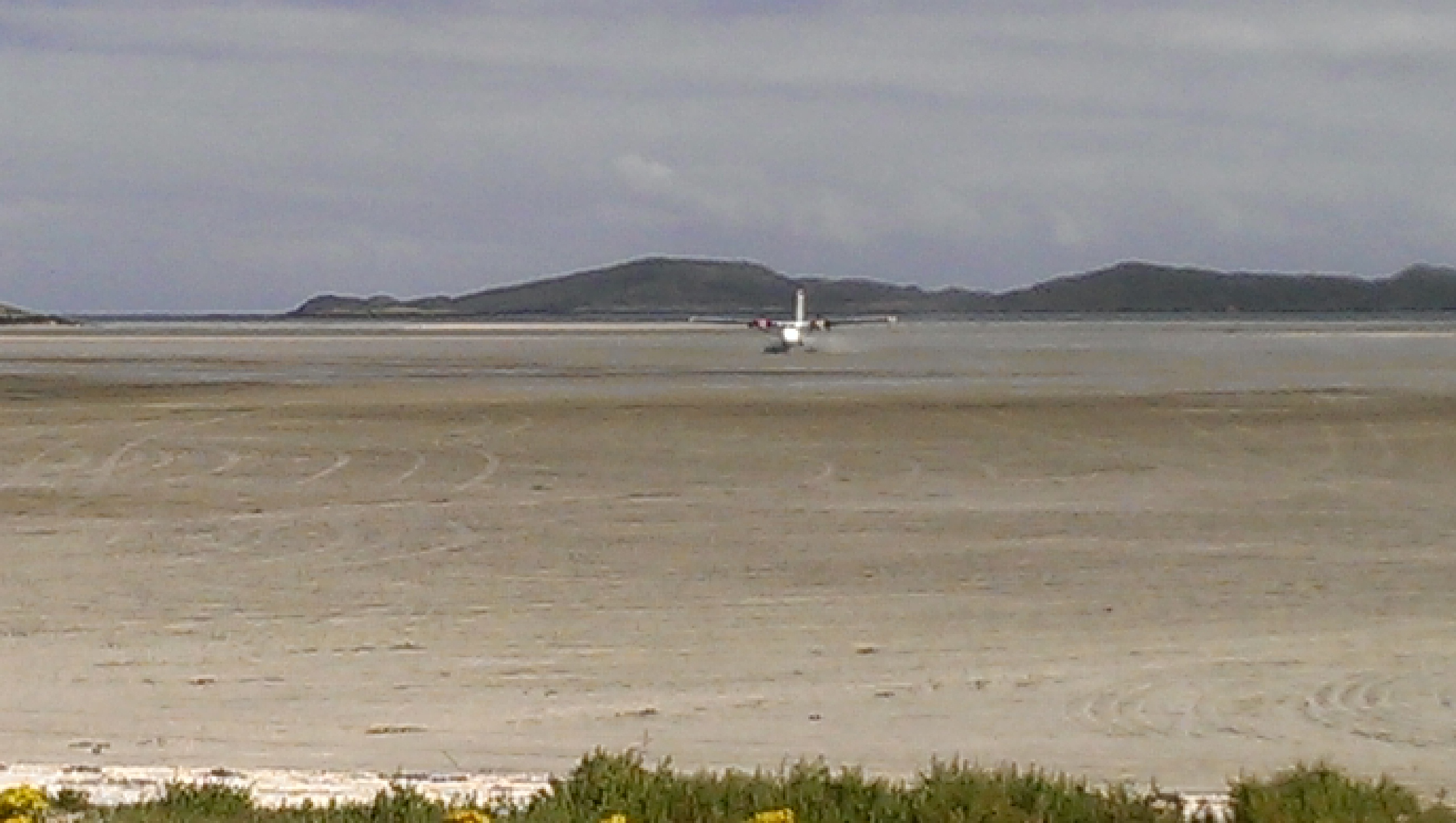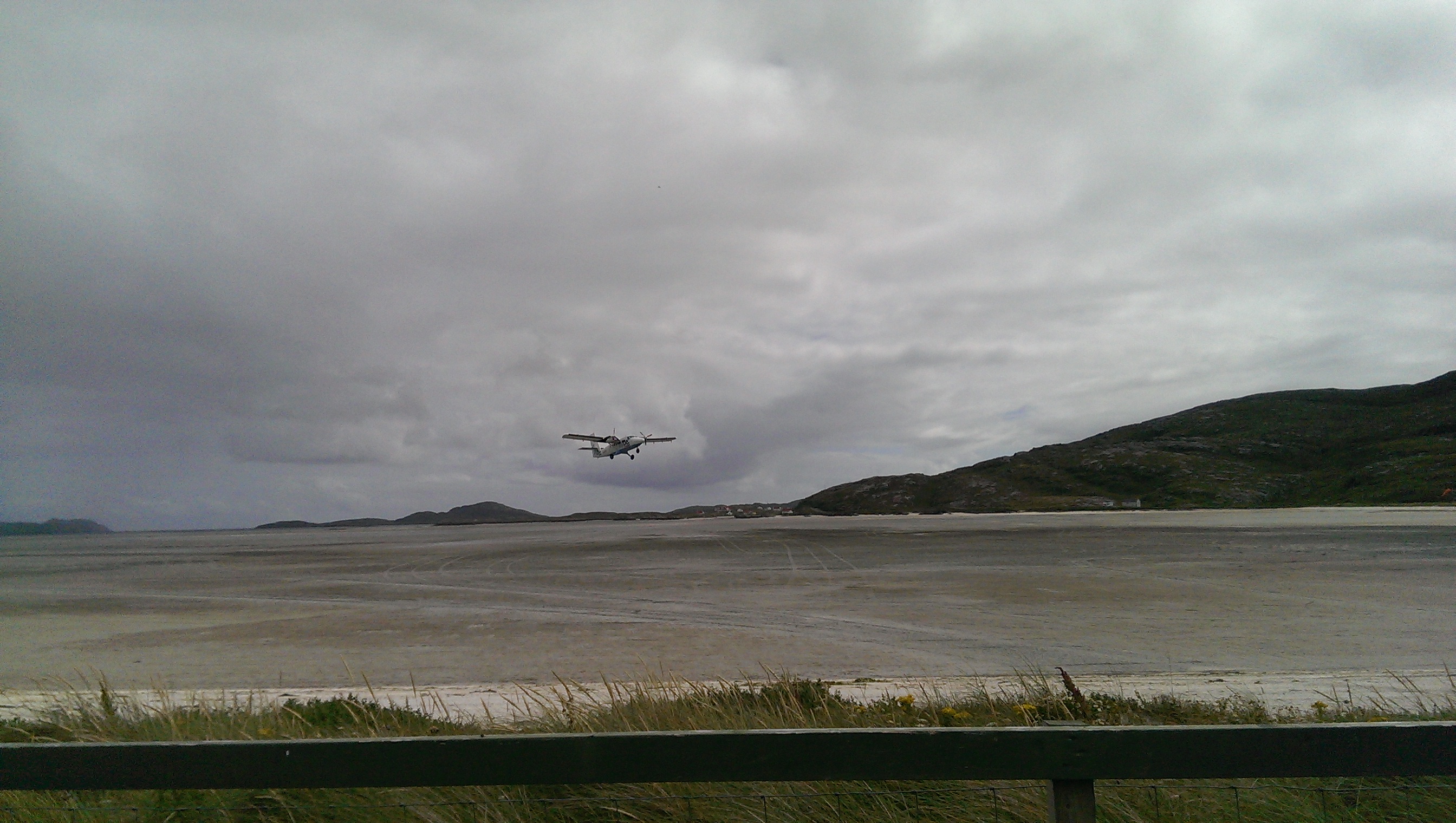 Now the map showed the ferry terminal on Eriskay to be just round in the next bay, so what we hadn’t expected was that to get to it we had to endure, no, not a nice shoreside road, but a massive 15% climb to the Barra ferry. Ah well. At least there was a toilet at the terminal. We arrived on Barra just in time to make it round the bay to see the famous aircraft beach landing which is so quirky that we found ourselves two of several dozen spectators, some of whom had come to the island specifically to see the plane come in.
