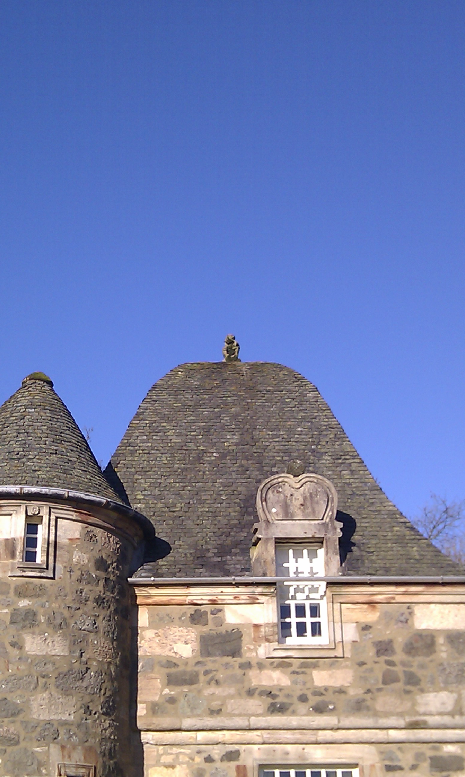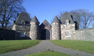 The route took me along from Renfrew to Bishopton and then up the Old Greenock Road to the Monkey House – so named because of the monkey stone statues adorning several roofs. This particular gem is Formakin House and it was designed by Sir Robert Lorimer for John Augustus Holms at the start of the 20th century. Holms planned and laid out the formal gardens before the house was was built, including a fountain, oriental and walled gardens, all joined by paths set with heart shaped stones. Somewhat of an eccentric, he did not suffer trespassers,and arranged tripwires in the grounds to catch out unwary visitors and land them in a muddy puddle. The house was built in the style of a 17th century mansion and its trueness to style is remarkable and fooled many experts. That the whole design was approached with a spark of humour is evident in the carved date of 1694 on a shield on one of the walls, accompanied by the letters DL, standing for Damned Lie The house was later owned by another eccentric, AE Pickard, who had a penchant for American cars but got bored when they broke down and simply left them lying about the estate while he swanned off in another purchase. Now transformed into several flats and smaller properties, it is nice to see the estate lived in again.