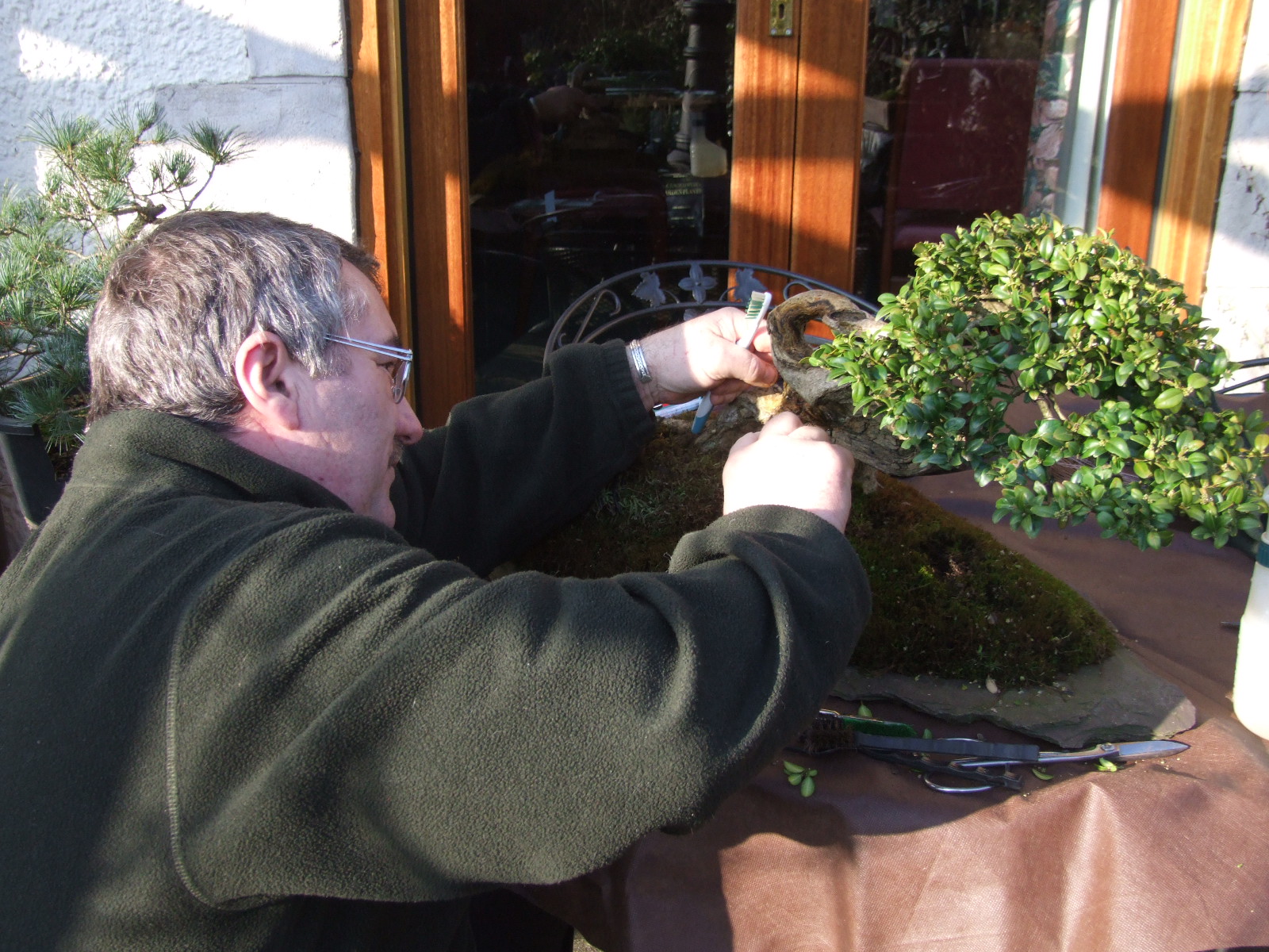 But by far the biggest excitement was a veritable orgy of bonsai activity this week. I had Senseless Sensei Steve here on Thursday and got through a remarkable bit of work despite the near permafrost in the bonsai pots. We worked on my Joy of Bonsai buxus, my Shohin Juniper which may be ready for the show next weekend, and The Beefie juniper (tell you about that another time.) We also did some development planning on my other trees and I have dutifully written it all down for future reference. It was a very good day, and I managed to follow it up with a visit to Wattston on Saturday to meet up again with Steve and the other guys and gals at the workshop. And of course I got the chance to see Dougie’s new imports from Japan. And equally of course I came away empty-handed! Pause to extinguish flames from underwear. Sunday saw a workshop hosted by the Ayrshire group with Corin Tomlinson as workshop leader. I have never met Corin or experienced his way of working, and I have to say I was favourably impressed. He took the time to explain fully what he was doing in his demos and his manner and approach during the hands-on workshop was excellent. In fact my only criticism is that the day was way too short. I took the opportunity to work on a semi-cascade white pine which is a long-term project tree and is really just for fun. It’ll never make a serious bonsai (not for about 25 years that is) but it’s a good learning experience.